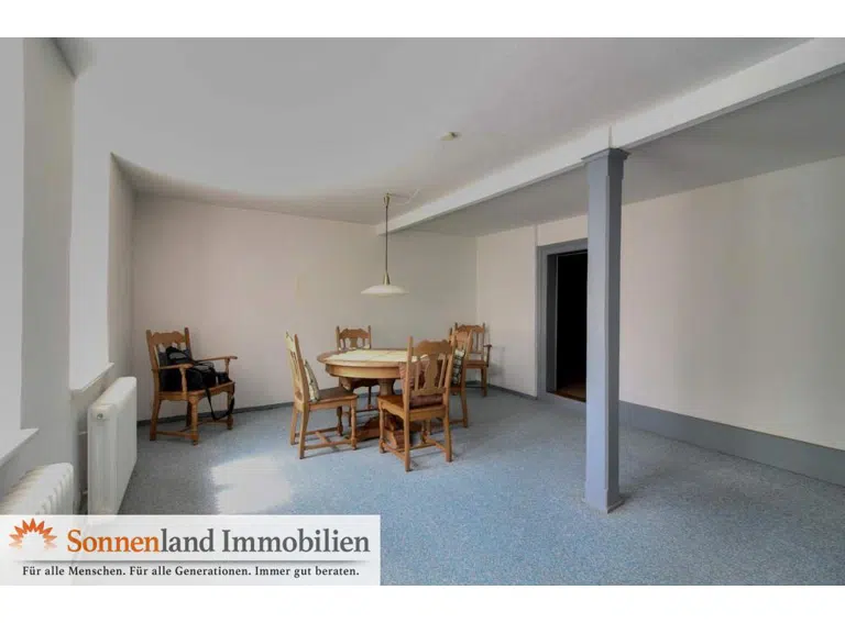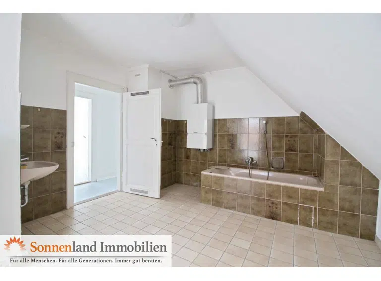 Das Haus hat weitestgehend "normale" Deckenhöhen (nicht überall), 5 kleine Zimmer (Wohnen + 4 x Schlafen), eine Küche, ein viel zu großes Tageslichtbad mit Wanne und uneleganten Fliesen, Gas-Zentralheizung, Teilweise Dielen, Teppich, Fliesen, zwei separate Toiletten und einen kleinen Erdkeller.