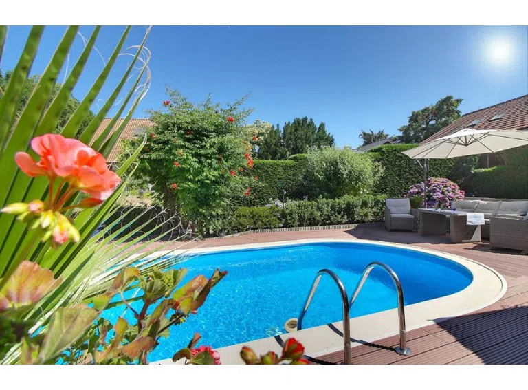 Dieses Doppelhaus wird zur Zeit als Dreifamilienhaus mit zwei getrennten Hauseingängen benutzt. Es gibt separate Zähler für die Wohnungen. Der Garten entspringt geradewegs einem Urlaubskatalog und darf als ausgefallener Privatluxus nicht ungenannt bleiben. Das Grundstück eignet sich auch für große Hunde, für die ein extra zweiter "Hundepool" angelegt wurde. Ein Brunnenhäuschen versorgt die Schwimmbecken kostengünstig mit Gartenwasser. Eine solare Unterstützung zur Beheizung der Anlage ist vorhanden.